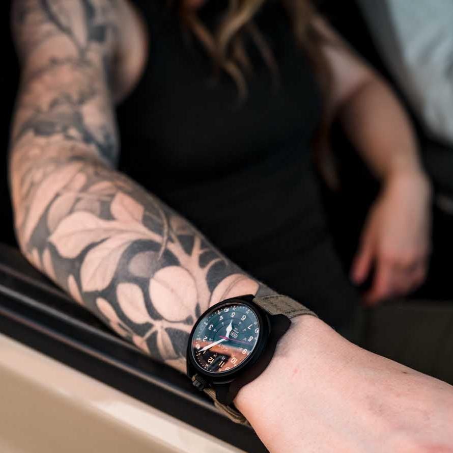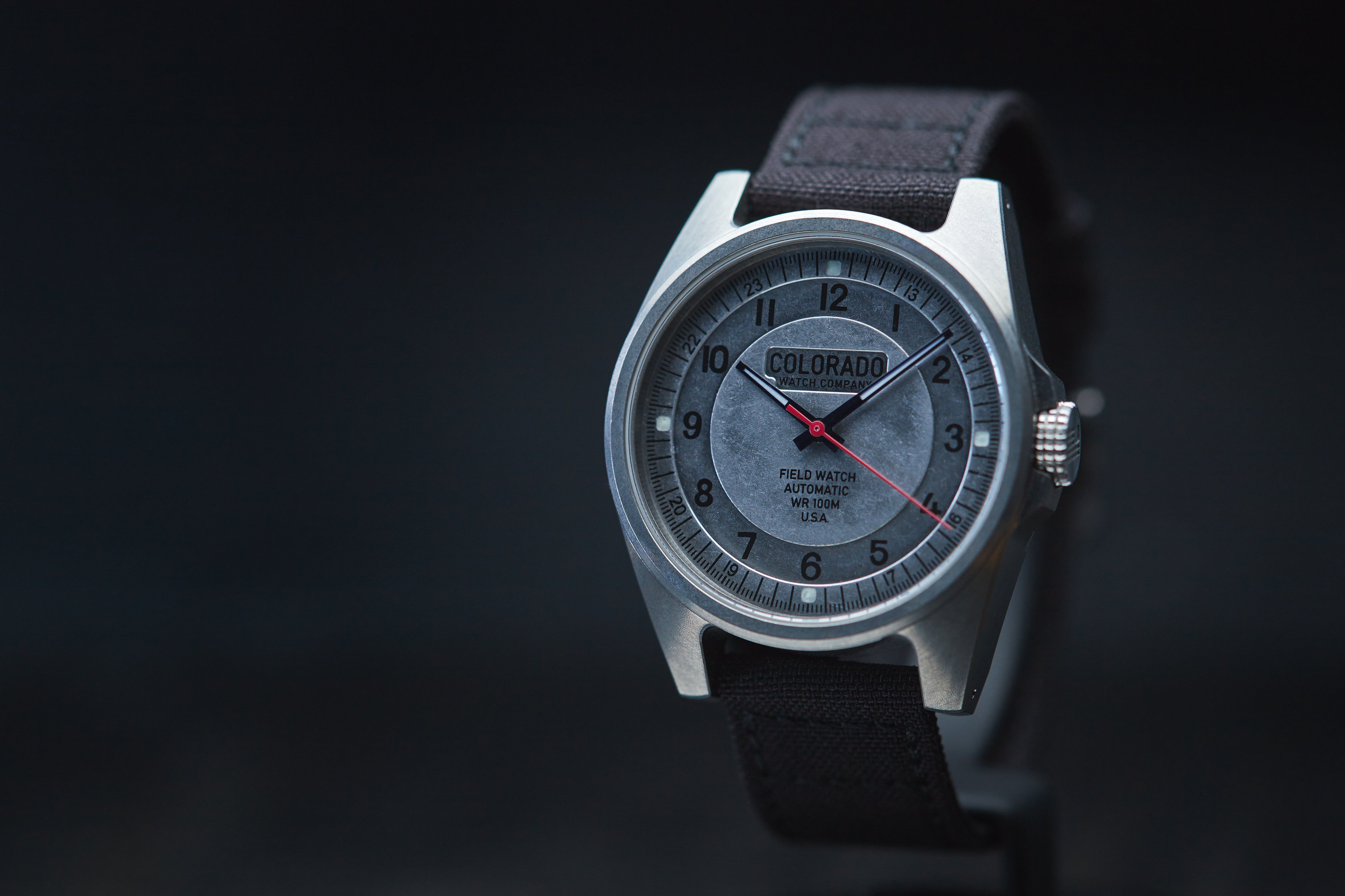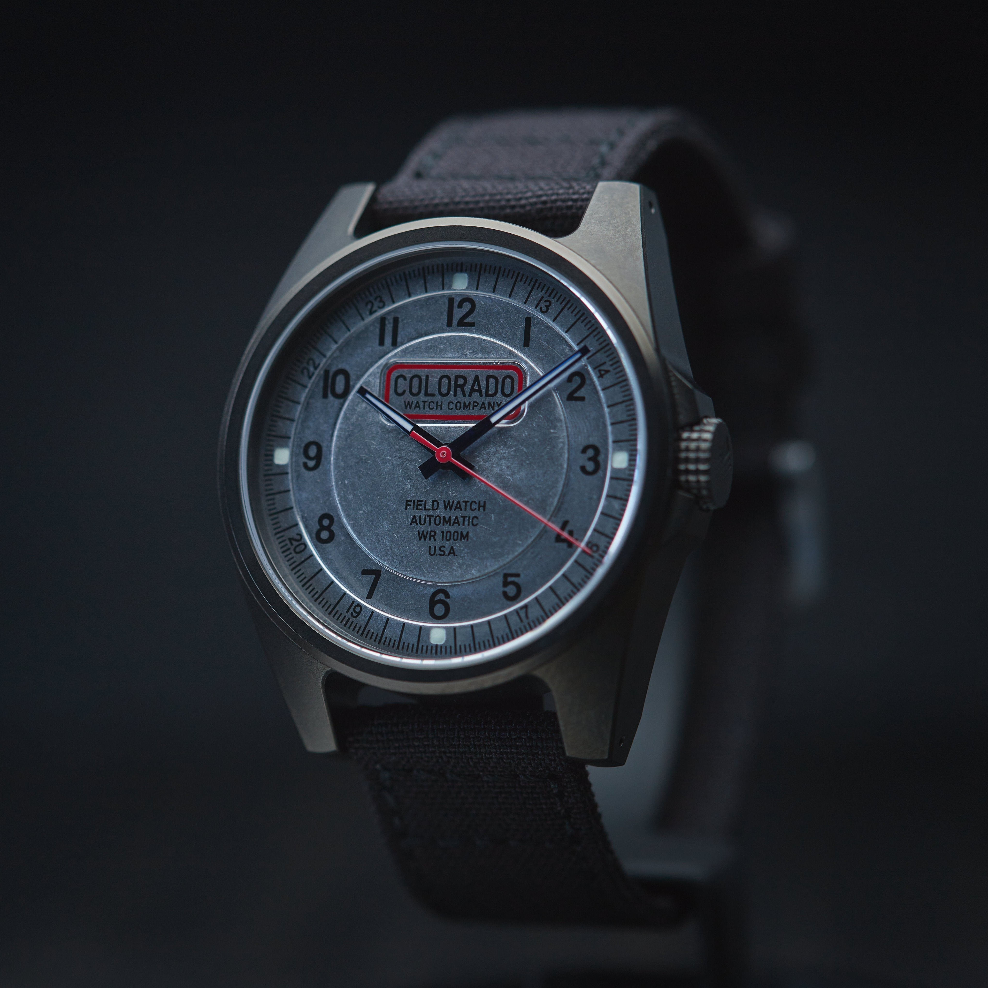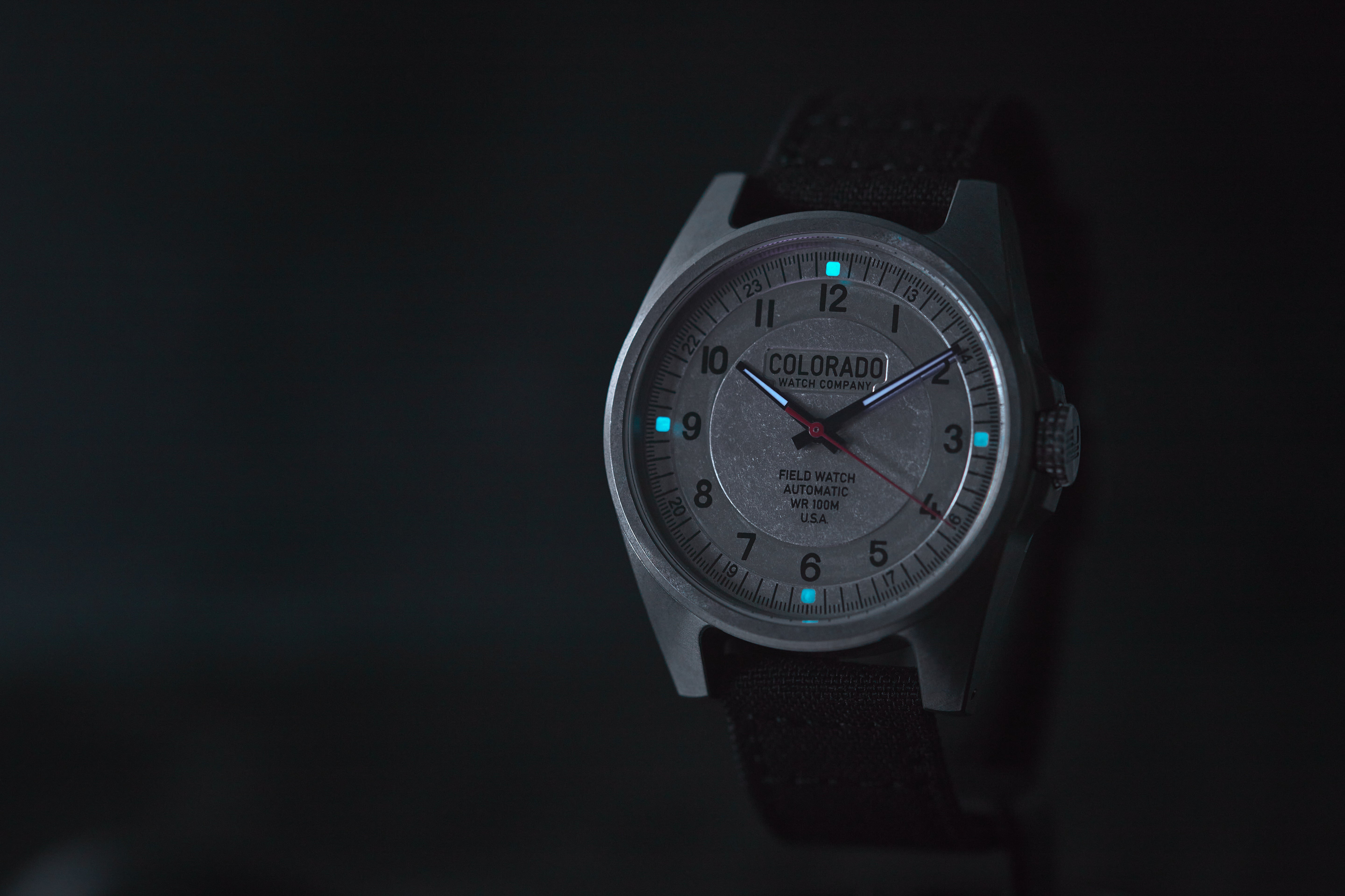 Making watch dials is extremely difficult. We found out the hard way why no one else does this at scale in the United States. But, after hundreds of prototypes, we figured it out. The Field Watch Dial is cut from aluminum, stonewashed, and printed here in Fort Collins Colorado. We even cut pockets at the four quadrants so we can hand-apply lume to give you a legible and functional design like no other.