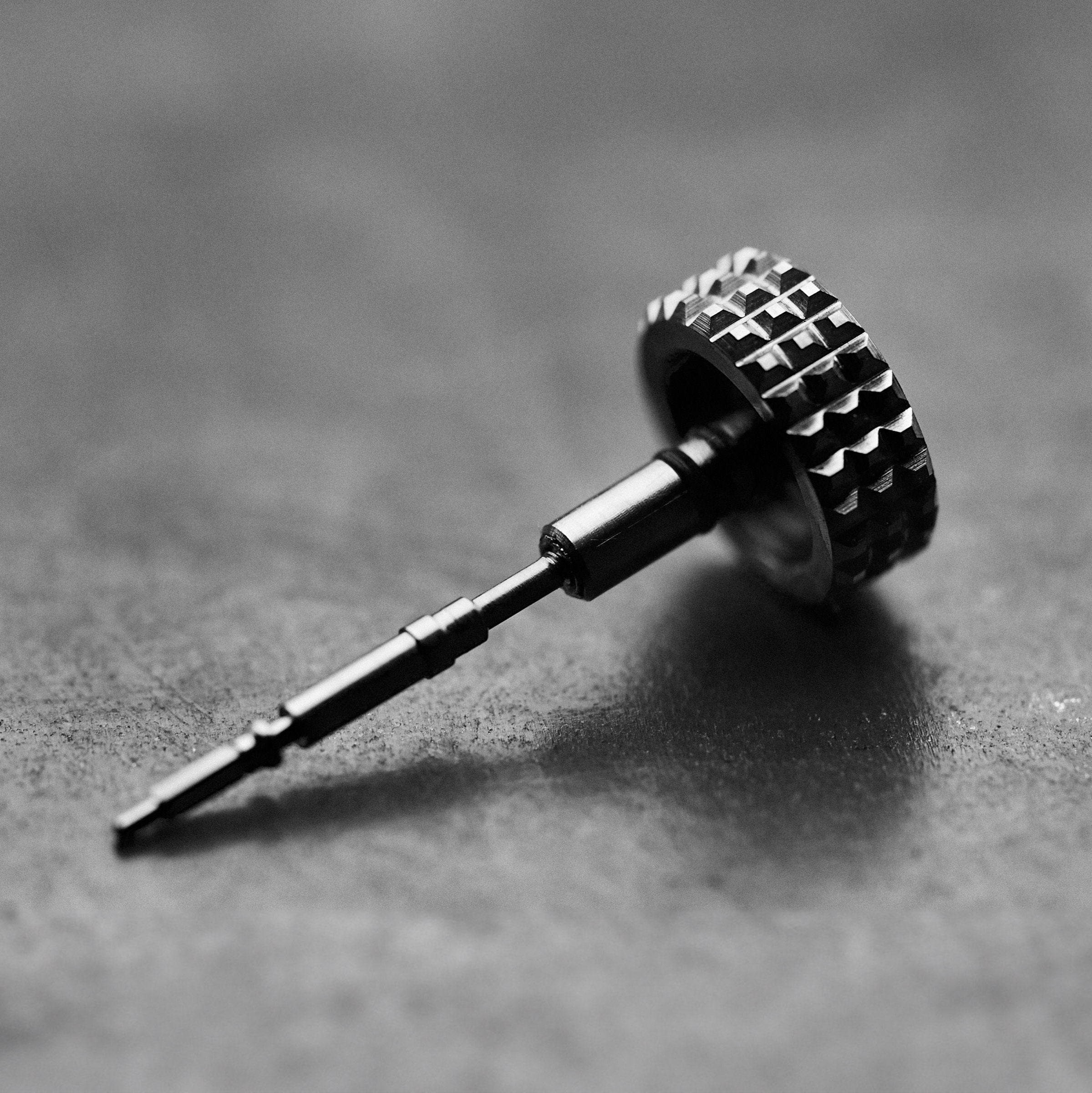 Our engineer, Sky has poured himself into learning to program this extremely complicated machine despite much of the manual being in Italian or broken English! These finished parts speak for themselves though. From the machined knurl and rounded flutes of the GCT crown to the laser-engraved flag on the Field Watch crown, we're very proud of these products.