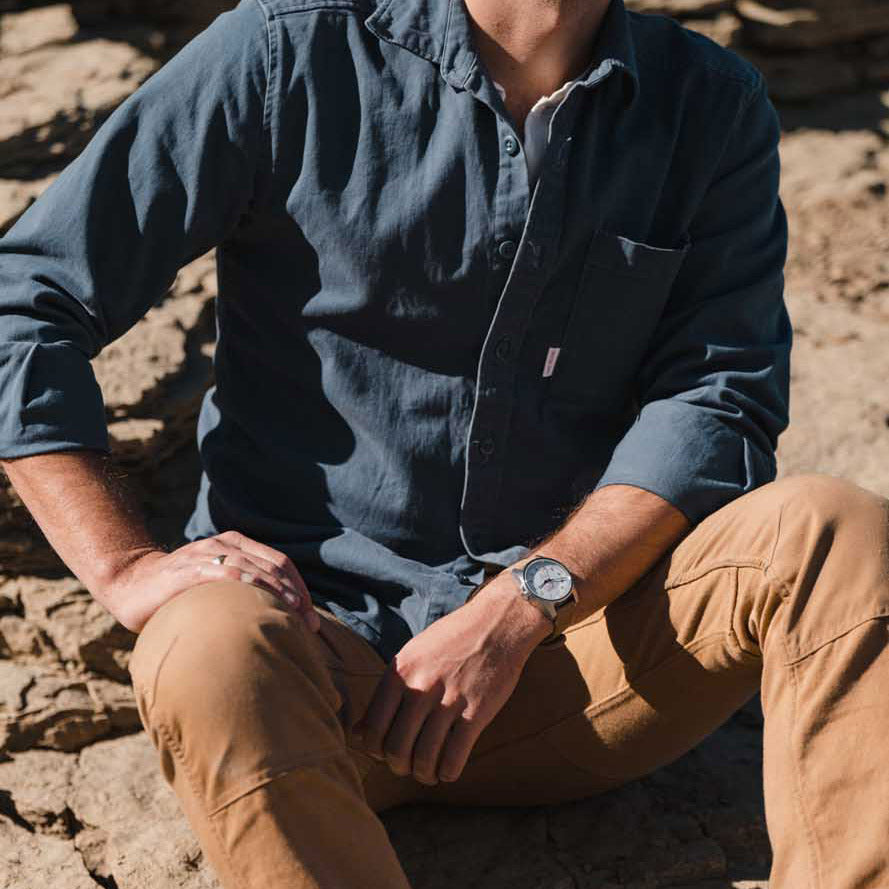 The 40mm diameter, 10.5mm thick stainless steel case was cut from a block of metal in Colorado with you in mind. We inlayed the case-back to make it very comfortable and stonewashed the case so it shows less wear. We cut in guards to protect the crown and added heavy knurling to make it easy to wind. The Field Watch features an automatic movement with 42 hours of power reserve though, so you won't have to wind it often, but you might want to since it feels so smooth...