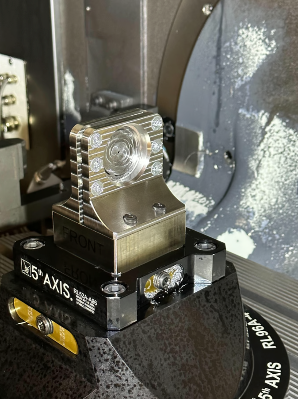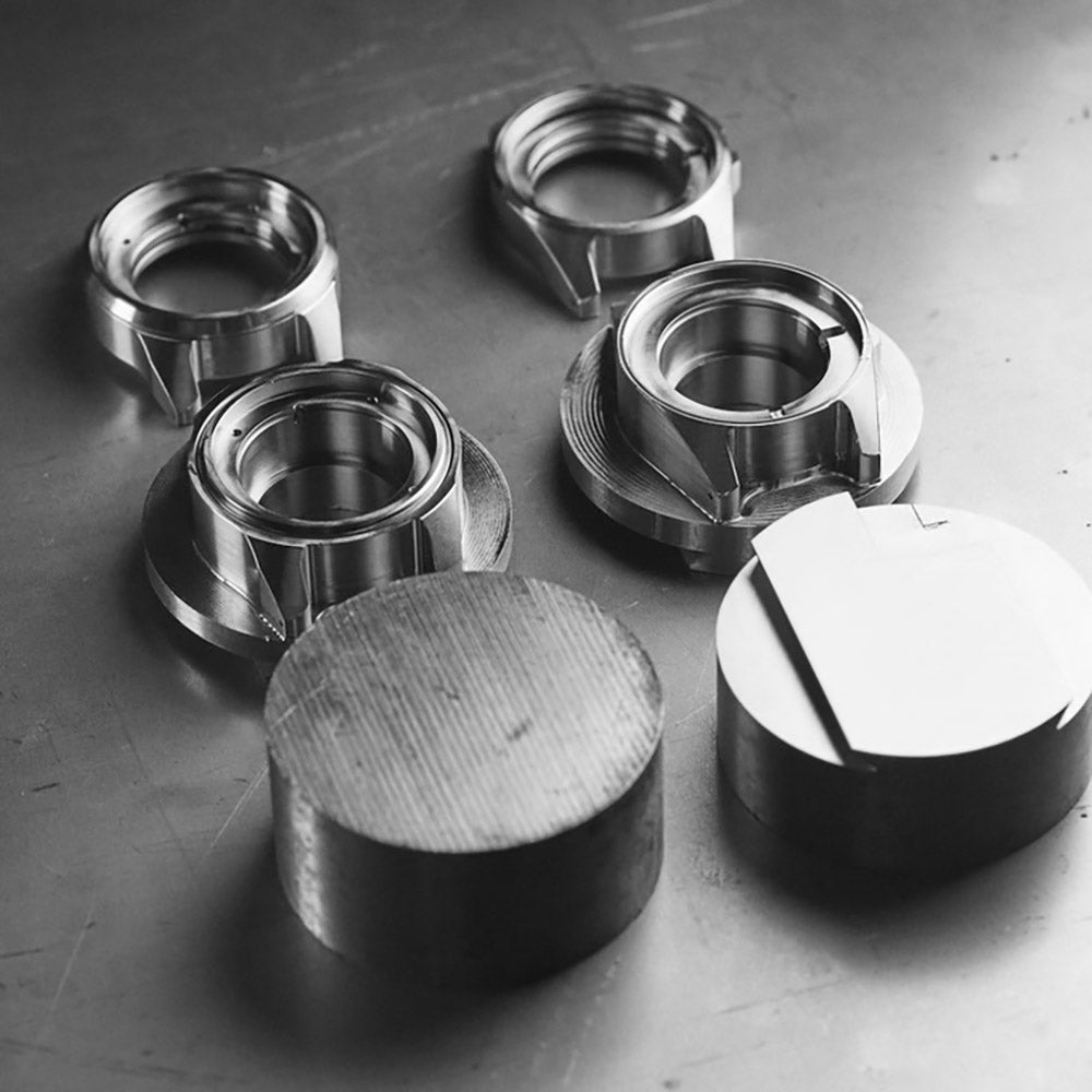 Currently, the case starts as a 2 inch "puck" of solid stainless steel. From there, we "prep" our stock to make it compatible with a dovetail vise fixture. This "pre-op" allows us to hold the material extremely rigidly and increases our precision and repeatability. After that, the prepped puck goes into the dovetail vise on our 5-axis mill, a DMG Mori DMU50.