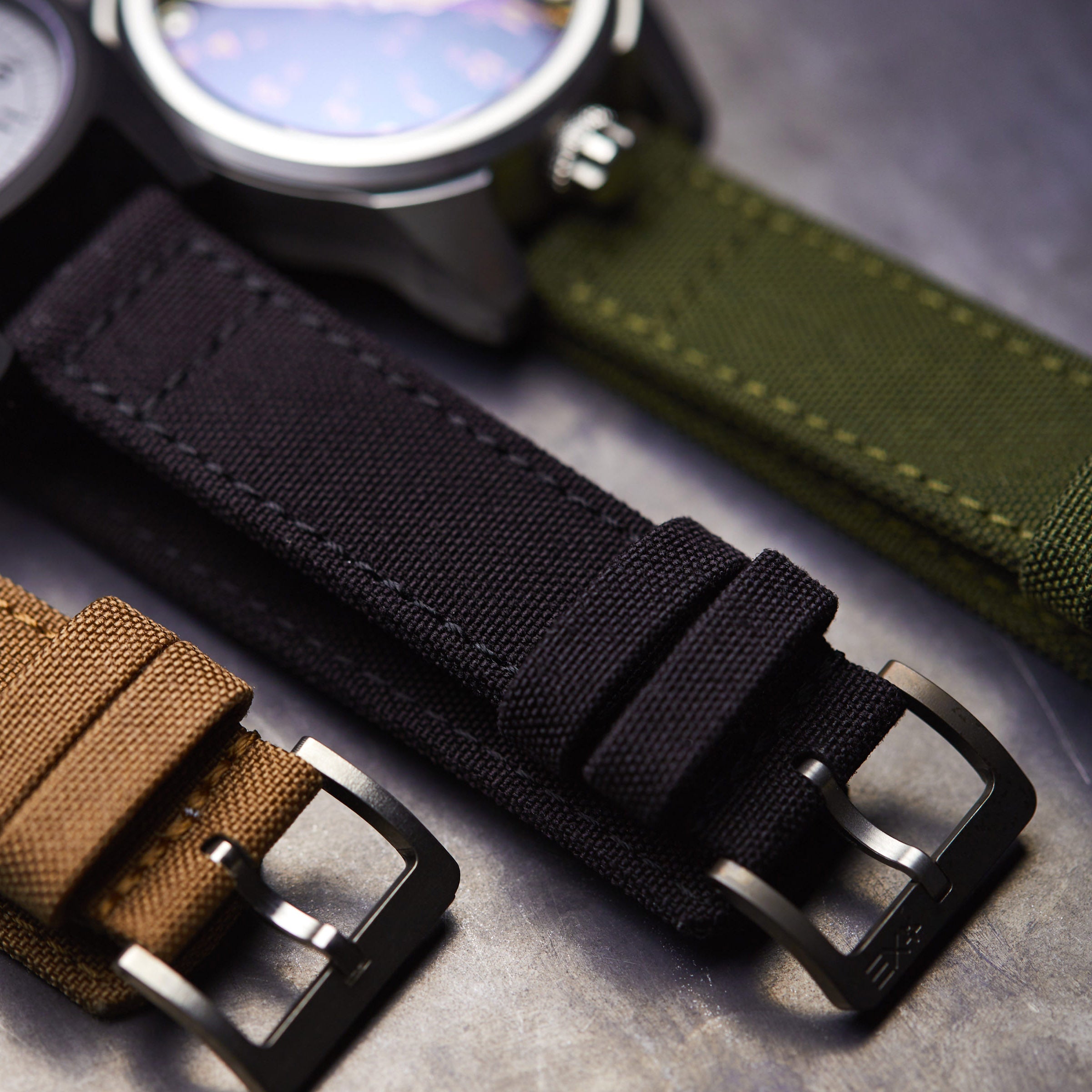 Our straps are made from Cordura, an especially durable synthetic canvas material that the military has used for its toughness. Every watch comes with one black strap and our in-house machined stainless steel buckle.